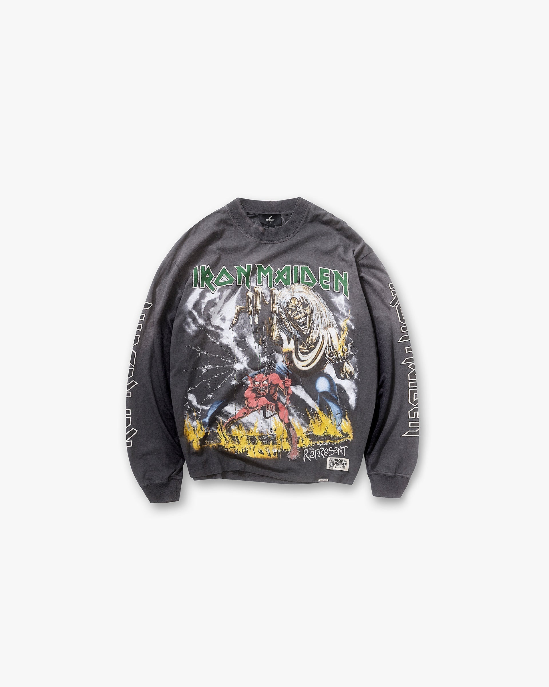 Introducing the Represent x Iron Maiden Number of the Beast Long Sleeve T-Shirt in Sunfade Grey, a tribute to one of the most iconic visuals in heavy metal history. Crafted in our classic oversized fit from a slub cotton-hemp jersey, this tee features front, back, and sleeve prints drawn from the original 1982 album artwork. A fade-out wash, puff print elements, and distressed finishing deliver a vintage aesthetic with modern construction.