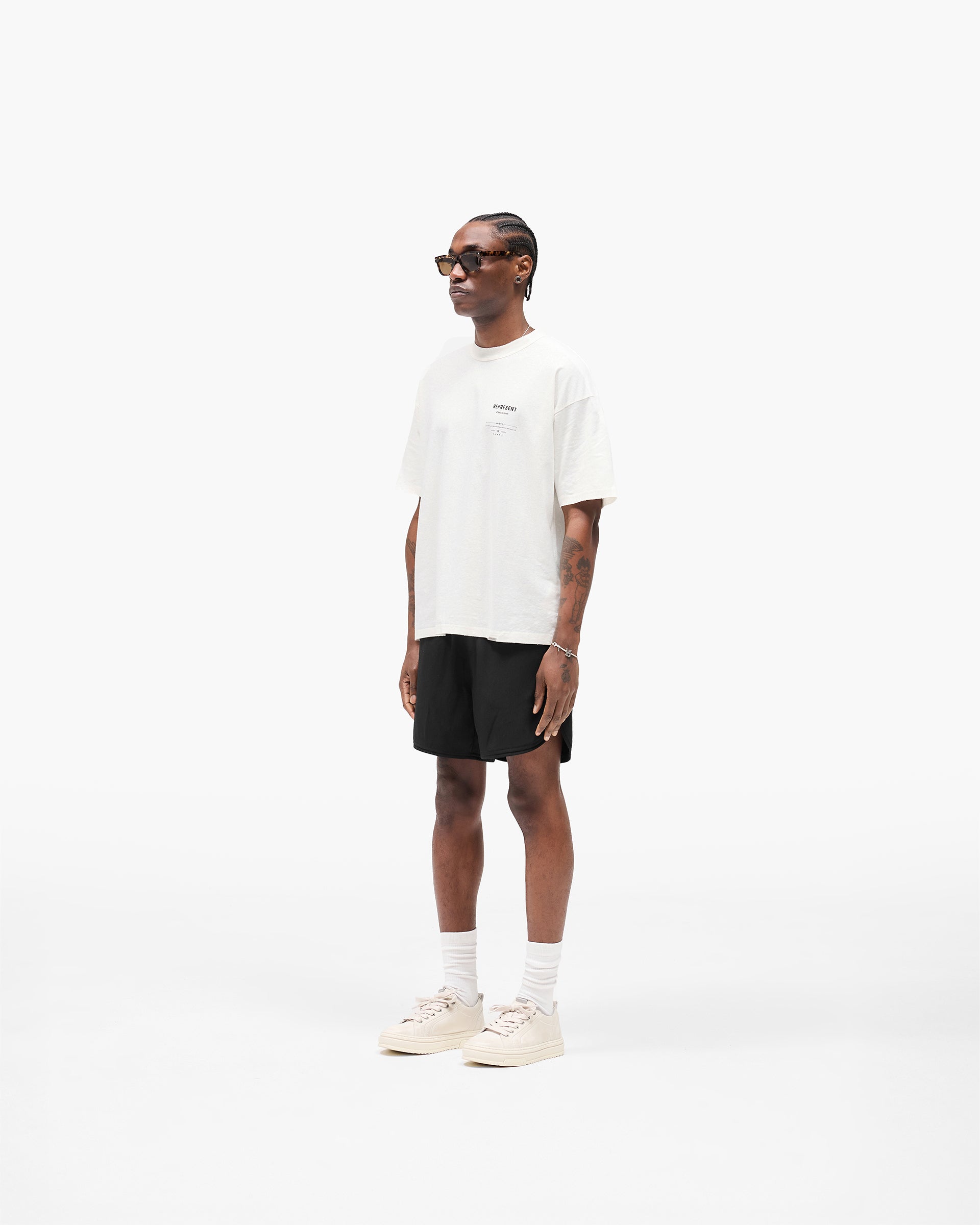 Introducing the Revere Manor T-Shirt in Aged White, a heavyweight jersey tee crafted from a slub cotton-hemp blend for a worn-in, vintage hand feel. Featuring a ribbed collar, chest print, and large distressed Revere Manor artwork to the back. Finished with a metal bar detail at the hem and subtle distressing throughout, this piece is cut to an oversized fit and designed to evolve with wear.