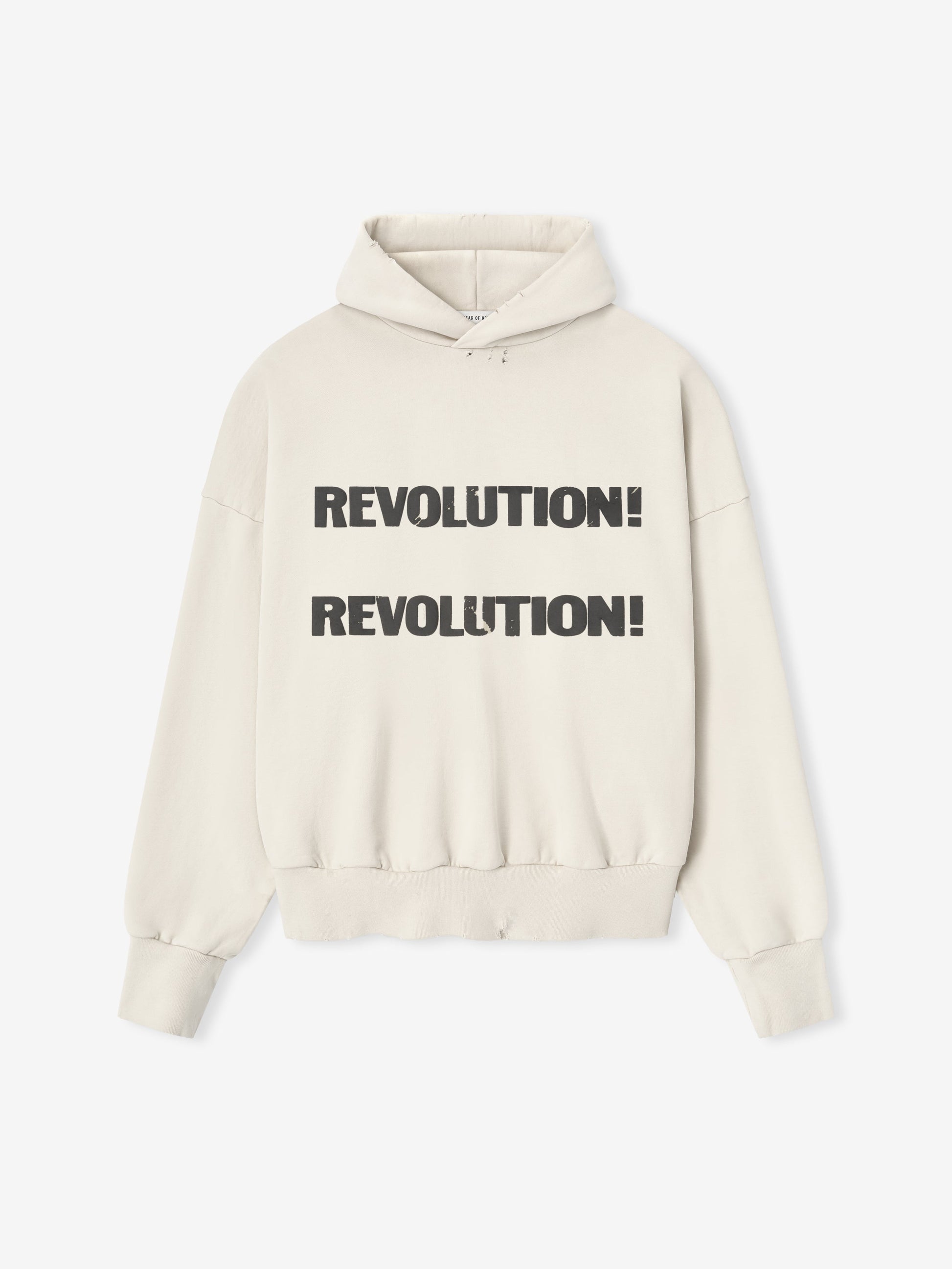 The Revolution Hoodie is crafted in the USA from 100% heavyweight cotton fleece and features a sunfade wash with hand-distressing for an authentic vintage appearance. The hand-printed graphics are inspired by the civil rights movement. This double-layer hoodie features a relaxed fit with drop shoulders, rib-knit cuffs and waist hem. A Fear of God label is stitched on the hood.