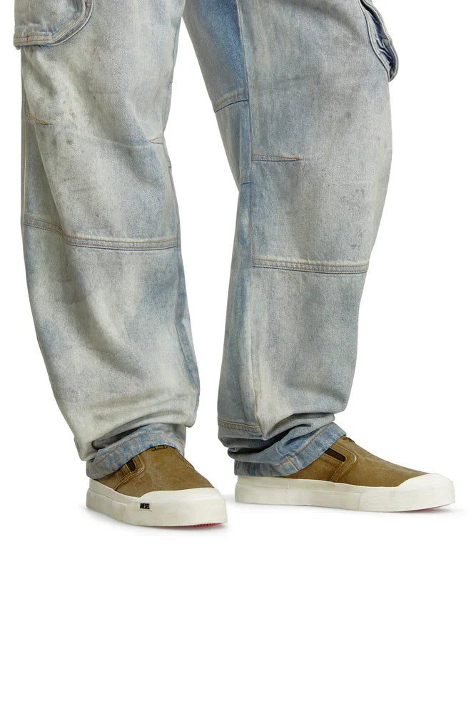 Men’s skater-style shoes with a slip-on design. Made from pigment-dyed cotton canvas, these trainers are constructed with a slimmer toe area, thick rubber caps and rest on chunky soles with contrasting red bottoms. An embroidered D logo hallmarks the upper.