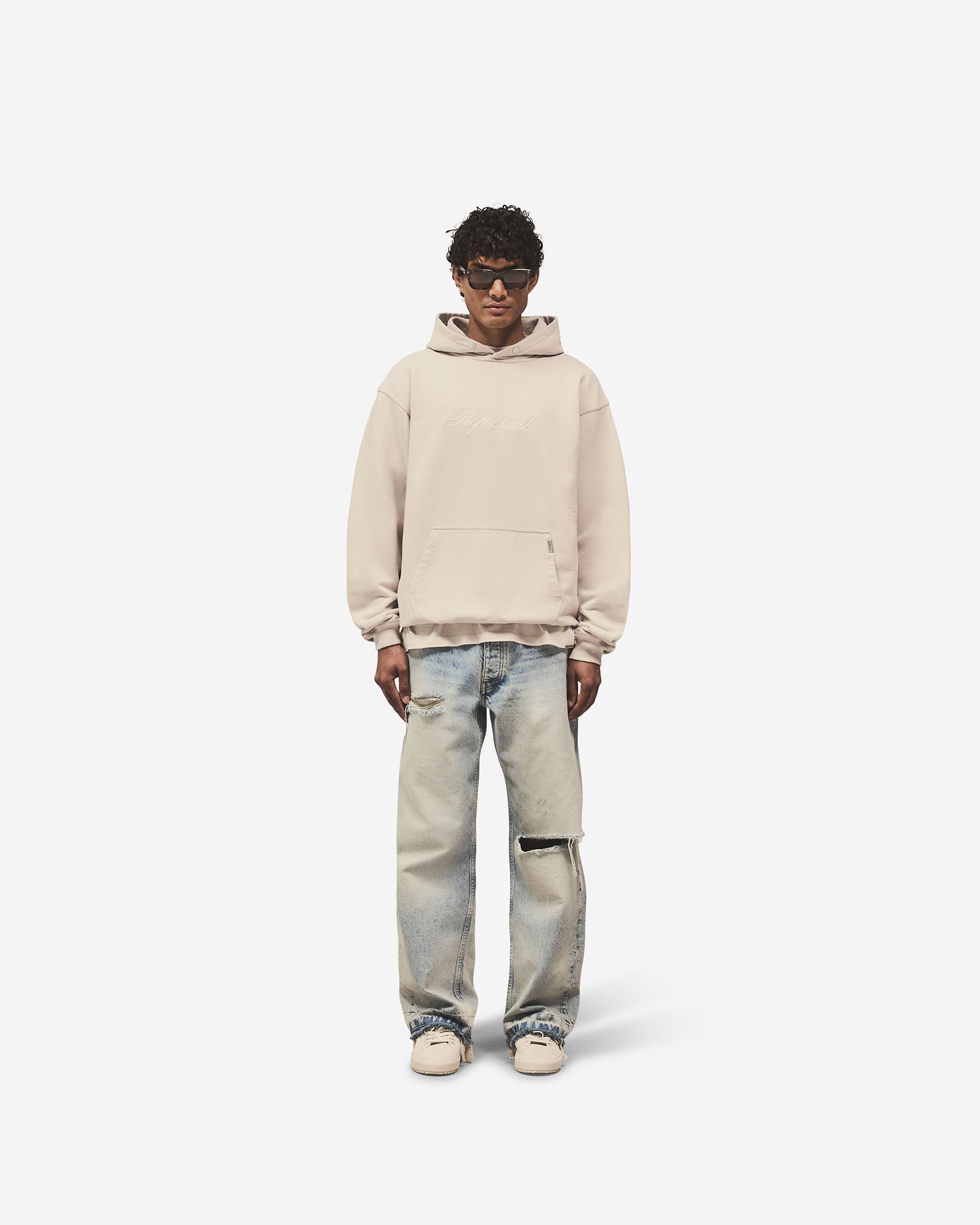 Introducing the Script Logo Hoodie in Concrete, a slightly oversized hoodie crafted from heavyweight jersey cotton with a smooth carbon finish. Featuring high-build matte script embroidery across the chest, the hoodie is designed for both comfort and statement appeal. It’s complete with a double-layered hood, Cobrax popper fastening, and a Represent metal bar at the pocket.
