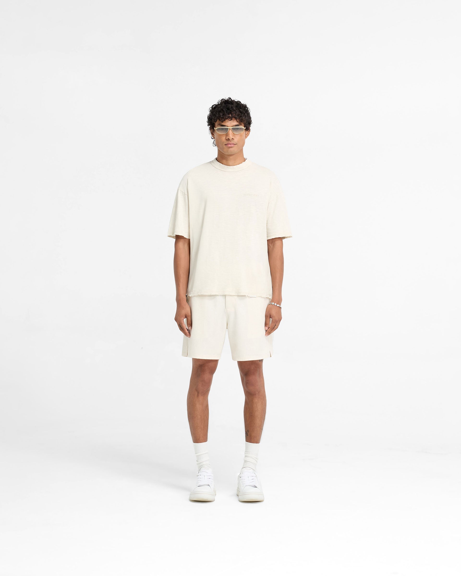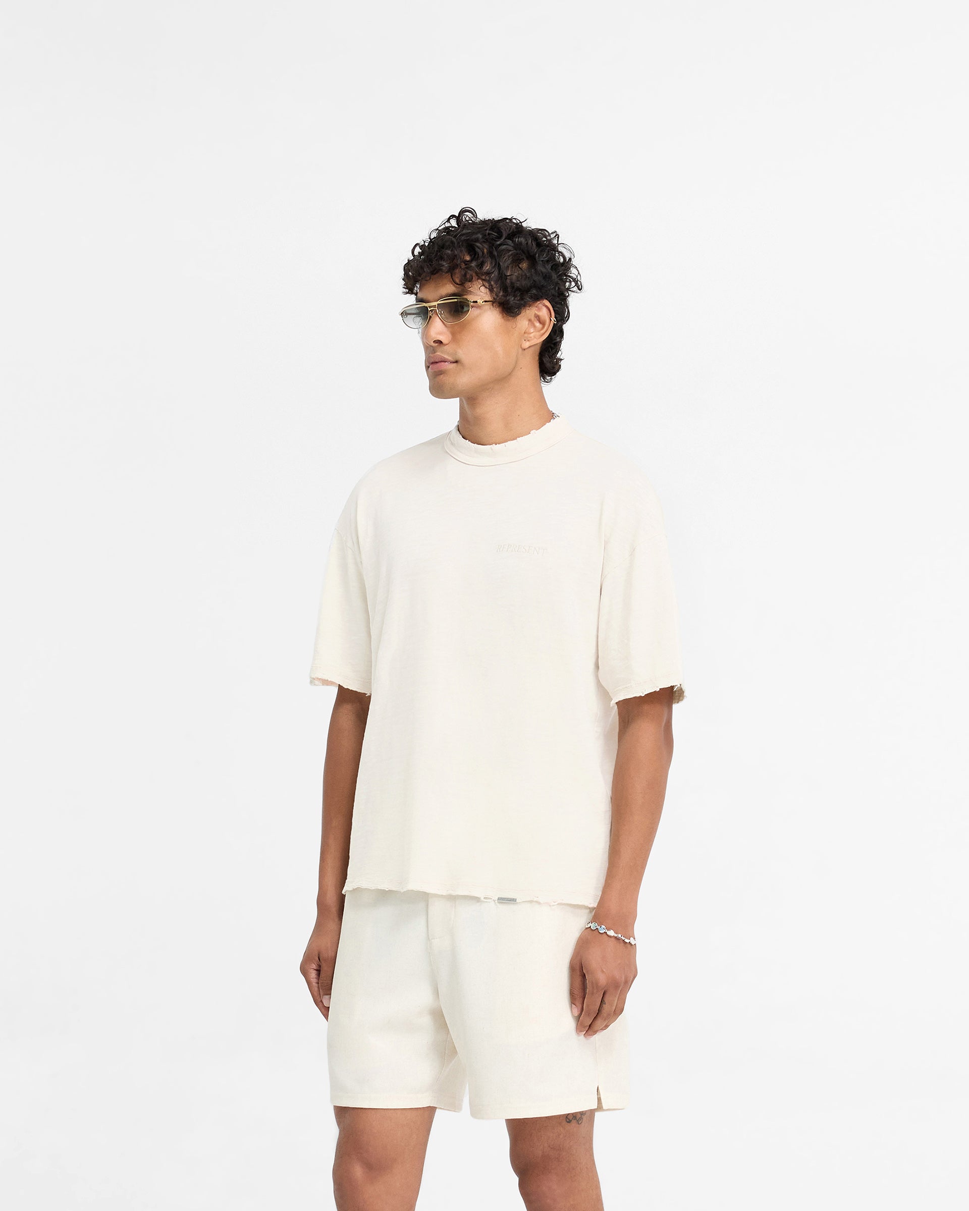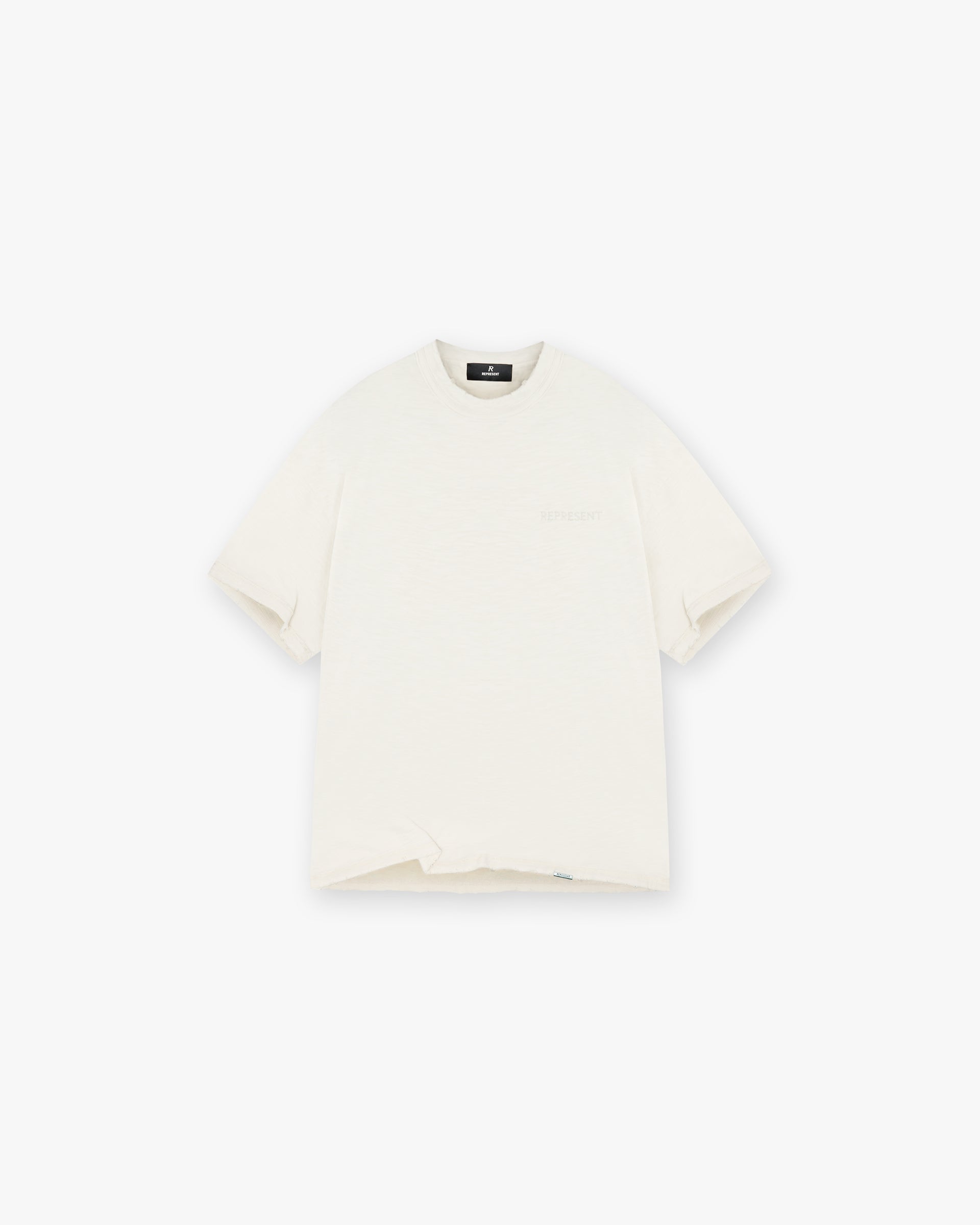Introducing the Slub T-Shirt in Flat White, a slightly oversized, lighter weight t-shirt crafted with an oversized fit from a 100% cotton slub fabric. The Slub T-Shirt showcases tonal embroidery of our serif logo to the front, offering a refined take on an everyday basic to be dressed up or down. The t-shirt has nibbling distressed details to the reinforced collar, raw hem and sleeves and is finished with a Represent metal bar logo to the hem.
