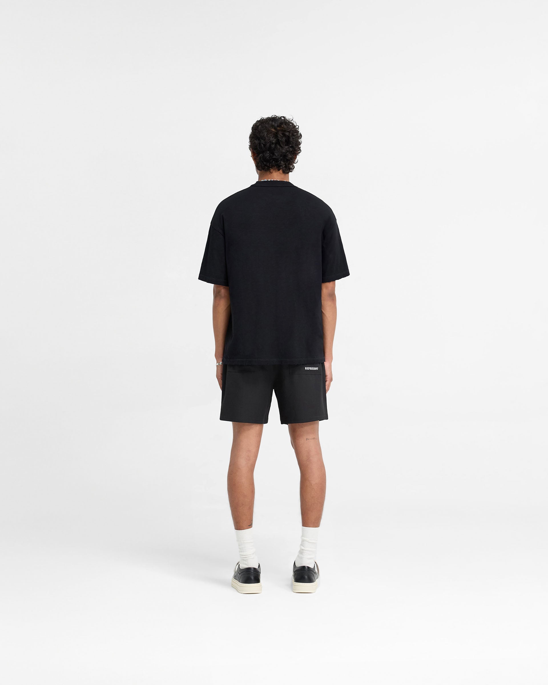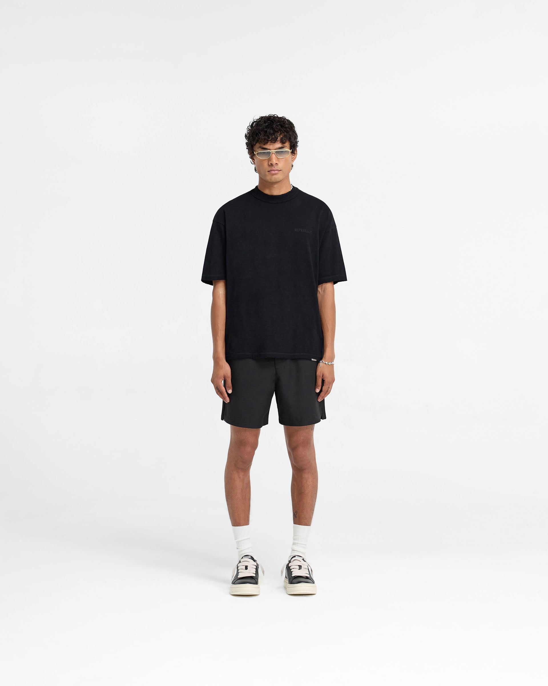 Introducing the Slub T-Shirt in Jet Black, a slightly oversized, lighter weight t-shirt crafted with an oversized fit from a 100% cotton slub fabric. The Slub T-Shirt showcases tonal embroidery of our serif logo to the front, offering a refined take on an everyday basic to be dressed up or down. The t-shirt has nibbling distressed details to the reinforced collar, raw hem and sleeves and is finished with a Represent metal bar logo to the hem.