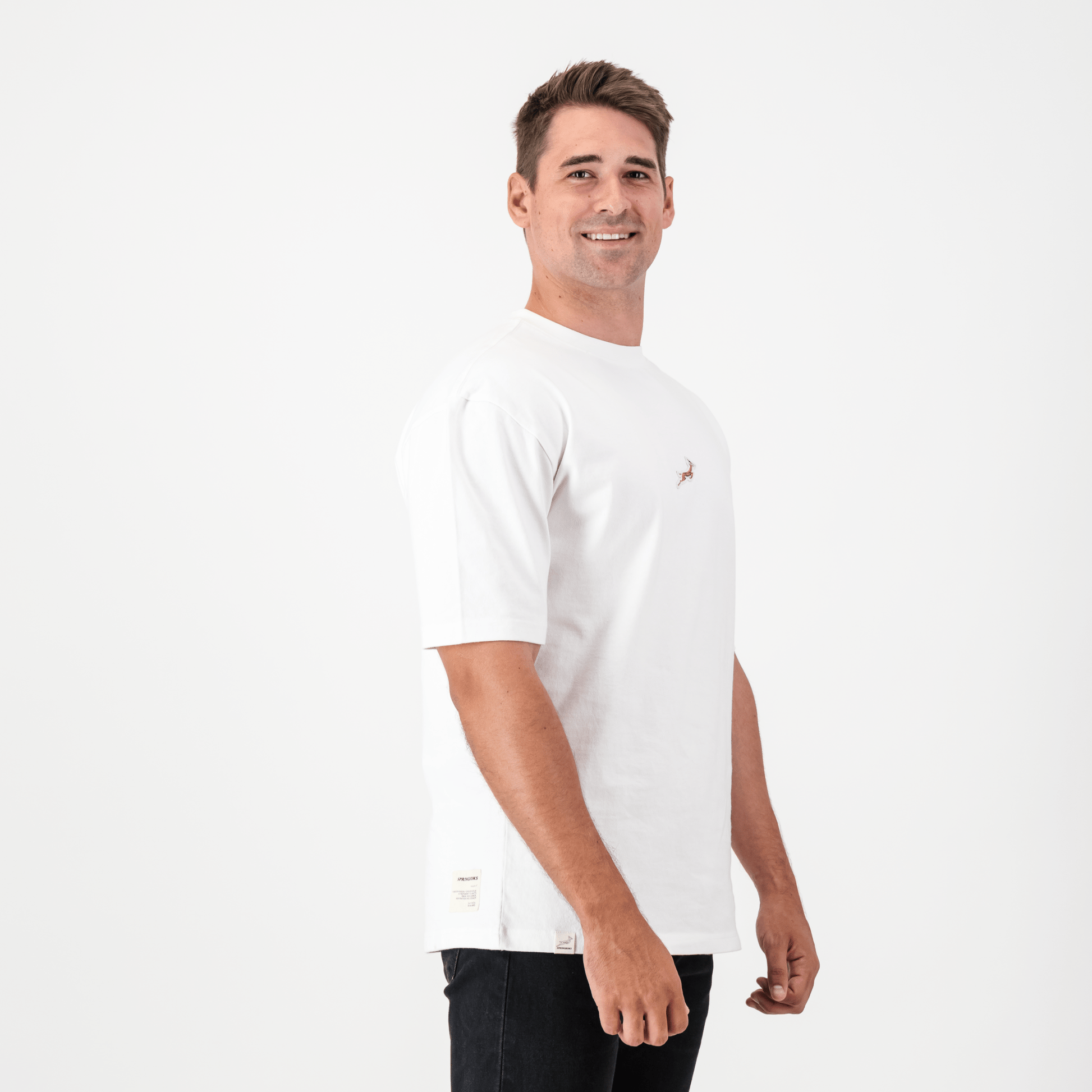 The Boxy Fit Tee is a summer essential. Made from heavyweight cotton with a luxurious suede finish, this garment caters to trendsetters and devoted Springbok fans alike, elevating leisurewear to new heights. Featuring a newly stylised Springbok embroidered badge in this season's vibrant colours, it perfectly blends style and team pride. Available in white, this tee is ideal for showcasing your love for the Springboks this summer.