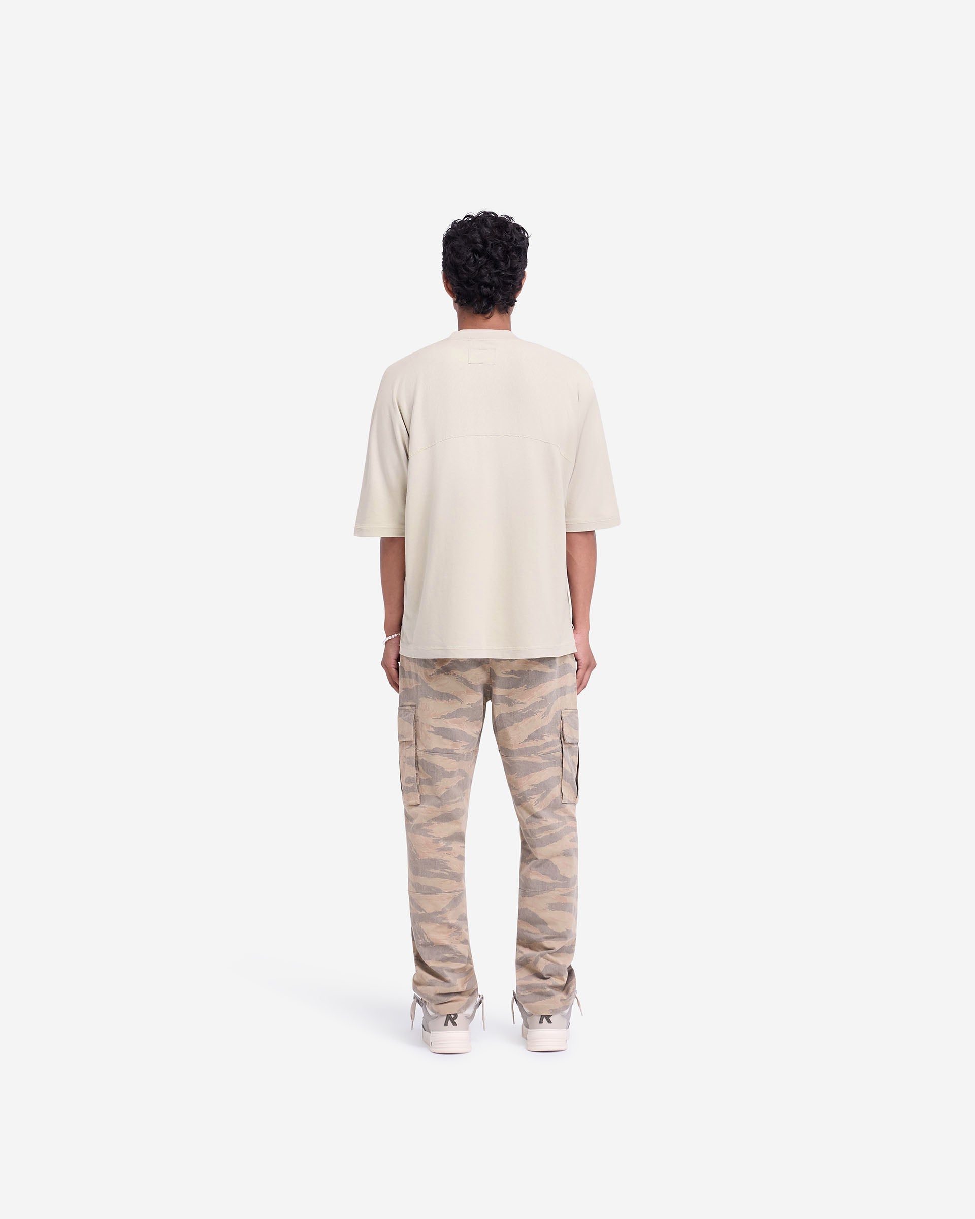 Introducing the Stepped Hem T-Shirt in Oat, a luxury oversized boxy t-shirt crafted with a sun fade wash for an authentic vintage look. The t-shirt showcases a split stepped hem, with overlock seam detailing. It is finished with a self fabric raw edge patch to the back neck, and a Represent branding tab to the side seam.