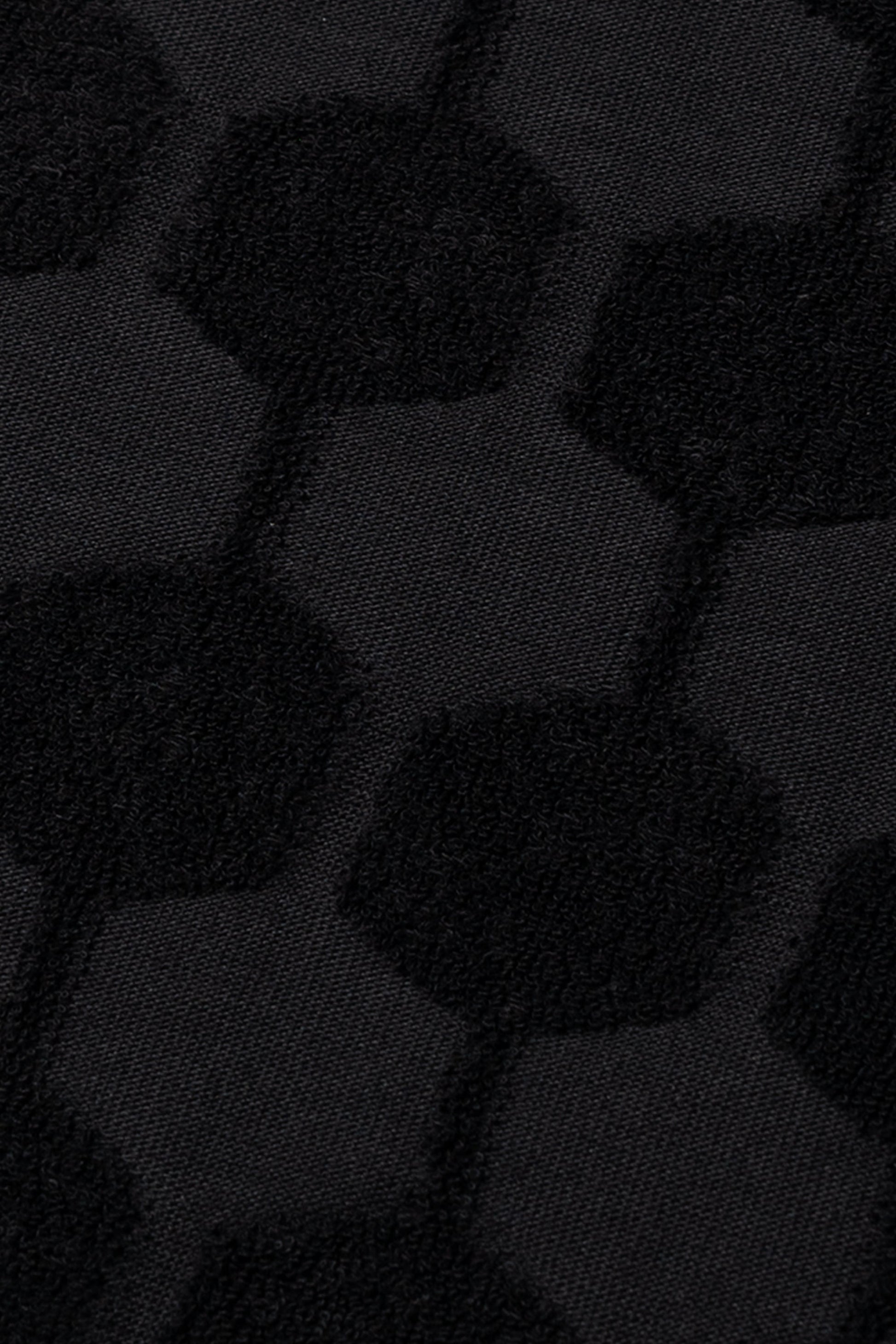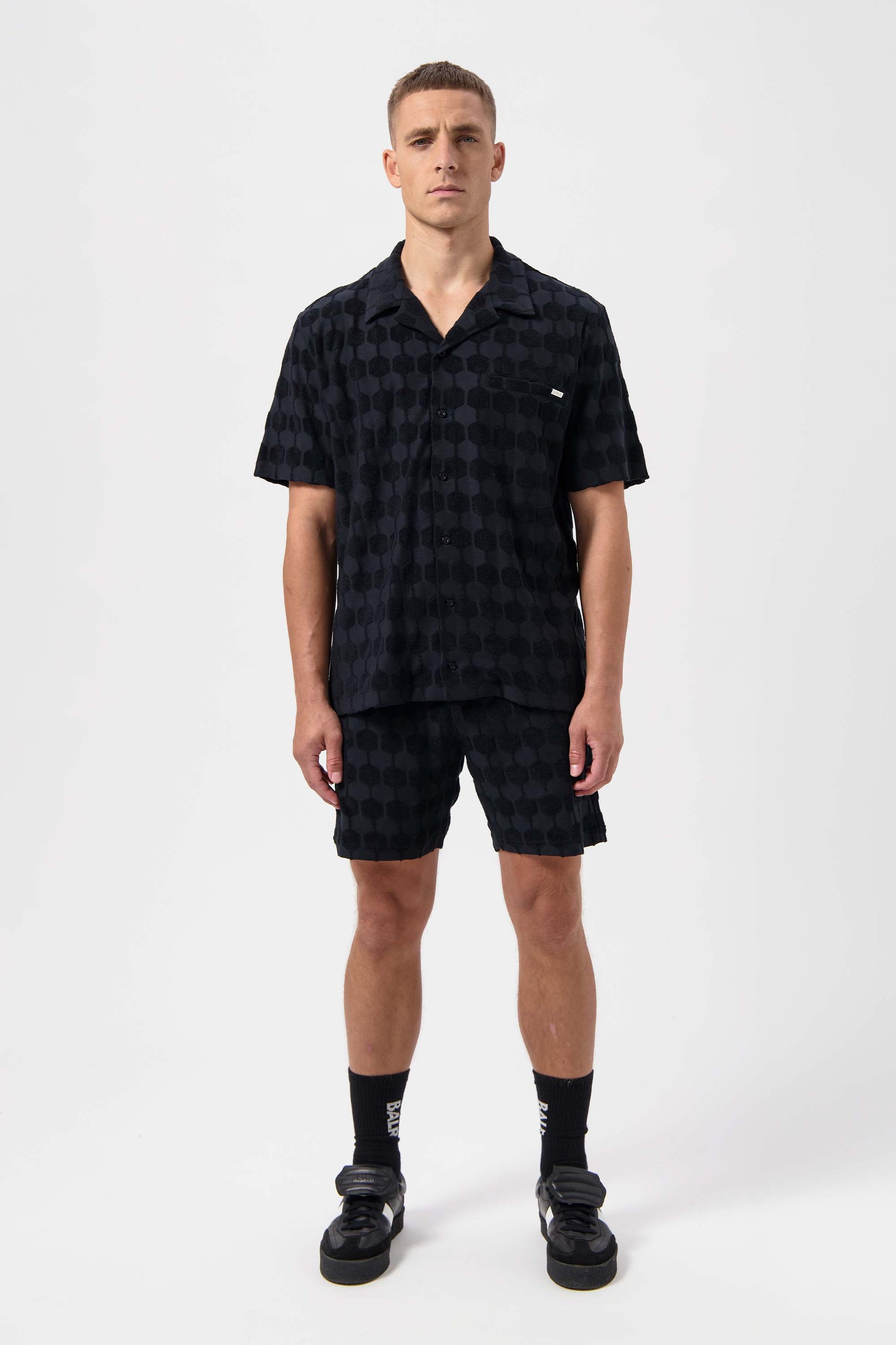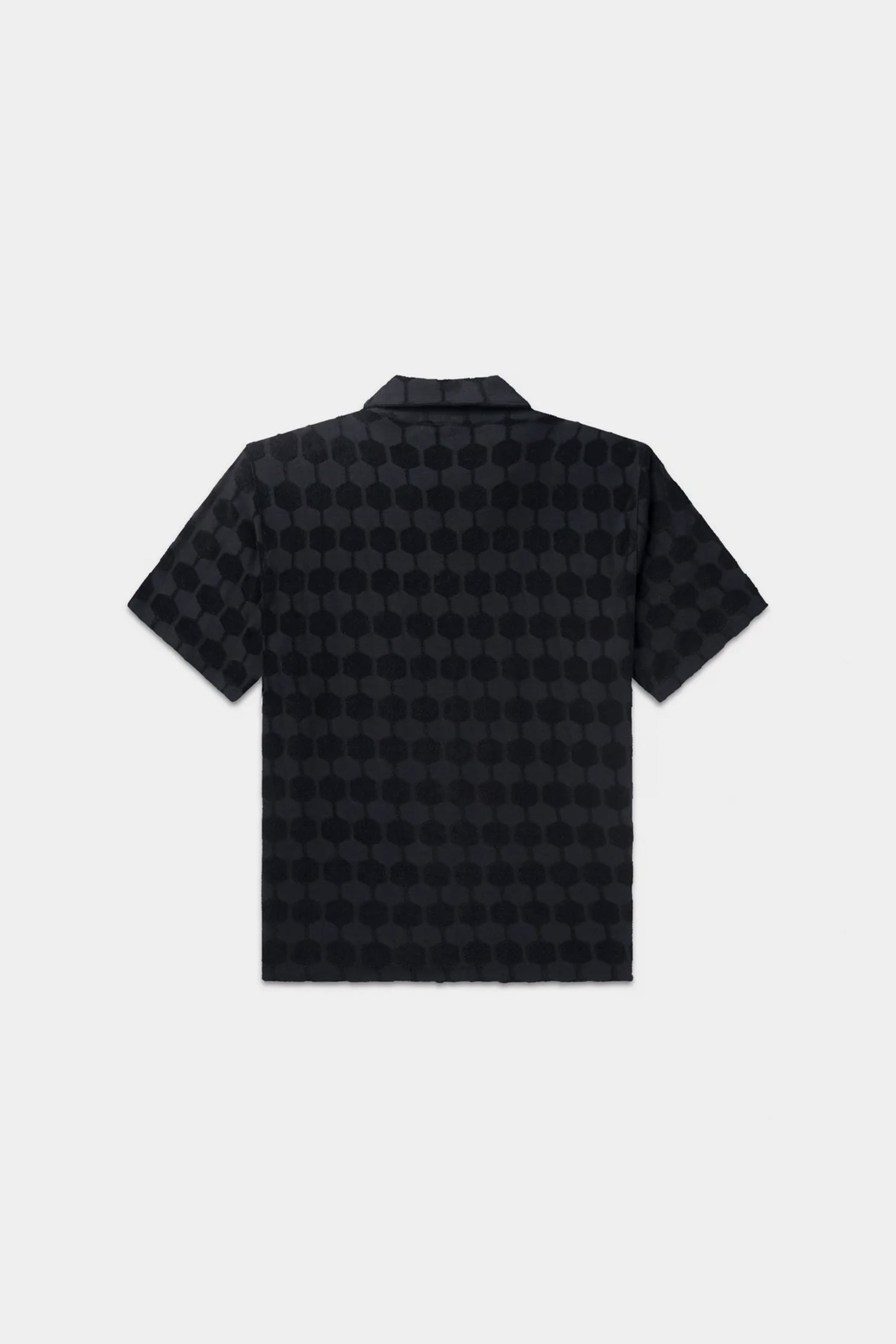 Introducing the Terry Box Shirt in sleek Jet Black. Made with soft toweling fabric in a unique hex shape, this shirt offers both style and comfort. The metal clip on the chest pocket adds a touch of flair to this versatile piece. Upgrade your wardrobe with this must-have shirt.
