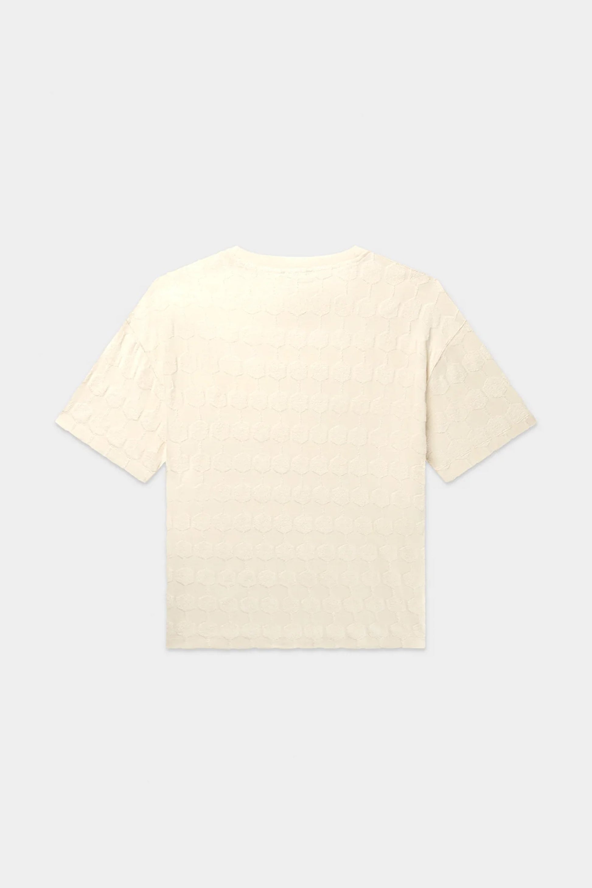 Introducing our Terry Box T-Shirt in Light Beige. Made with a unique toweling fabric in a stylish hex shape, this tee is perfect for everyday wear. Our signature metal clip at the hem adds a touch of flair. Stay comfortable and stylish with our Terry Box T-Shirt.