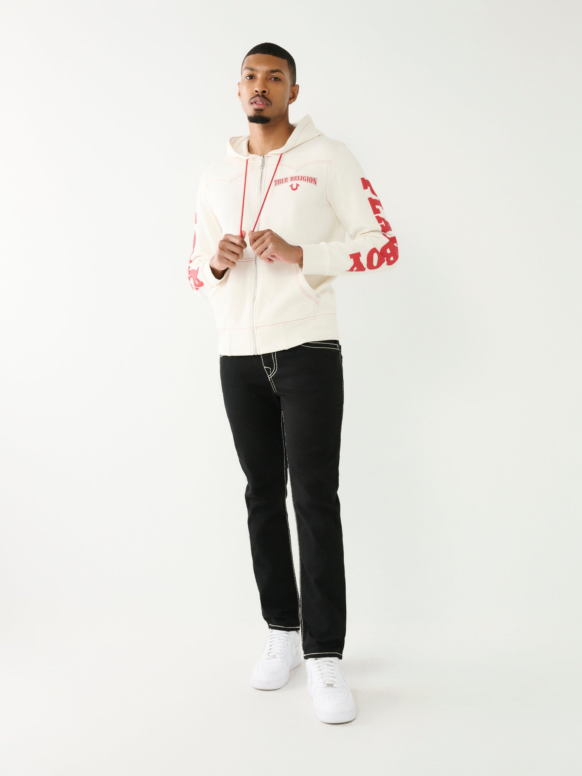 Elevate your winter wardrobe with the True Religion Western Hoodie Zipup in a chic Winter White. This stylish hoodie combines comfort and fashion, featuring a cozy fleece interior and a modern zip-up design. The iconic True Religion logo adds a touch of authenticity, while the classic western-inspired details ensure you stand out. Perfect for layering or as a statement piece, this hoodie is your go-to for chilly days. Embrace warmth and style all season long!