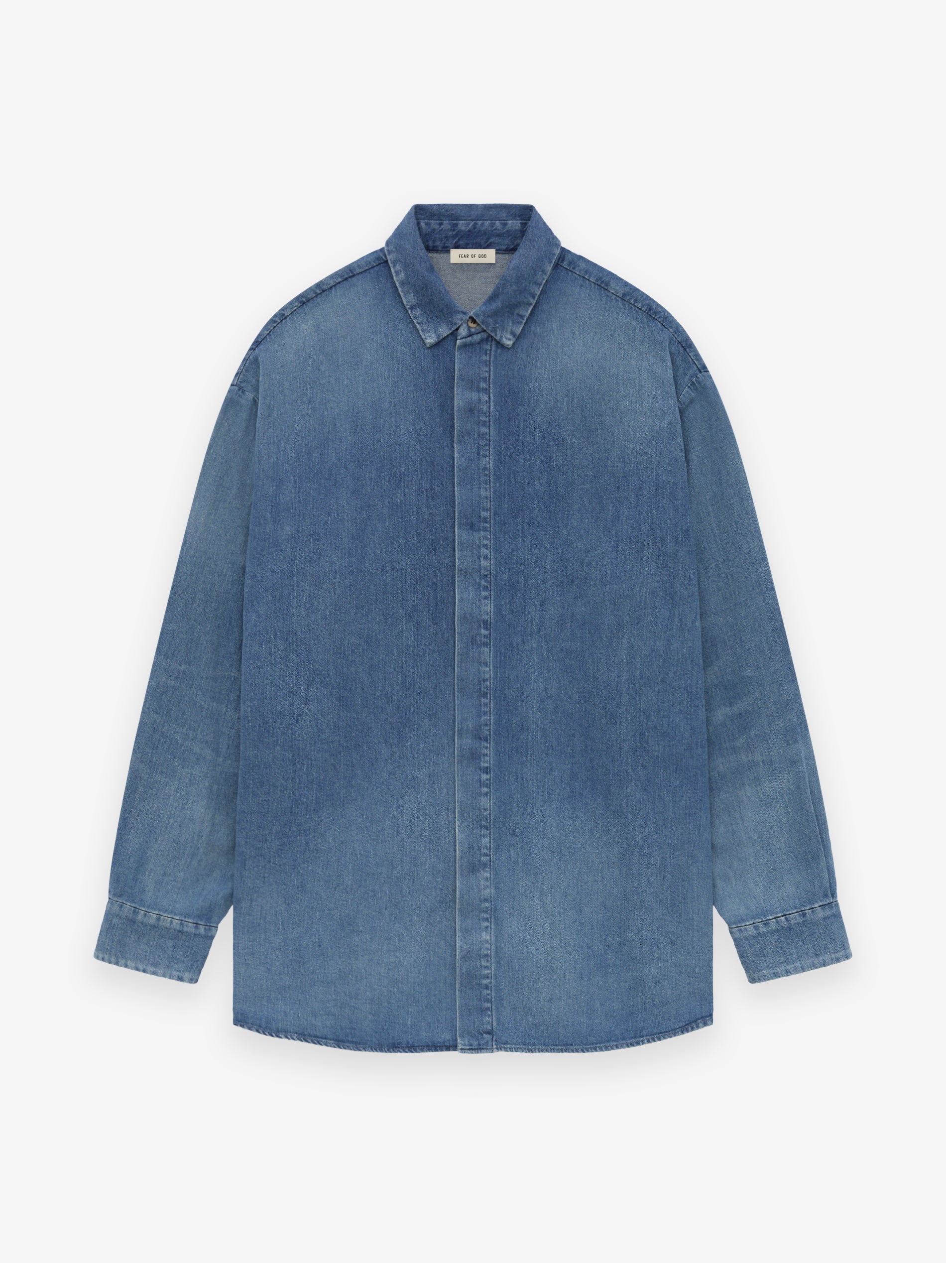 The Vented Denim Shirt is made in Japan from a vintage black Japanese denim. The fit is oversized with dropped shoulders, shirt collar, back vent, horn button closures, and barrel cuffs. The Fear of God leather label is stitched at the back collar.