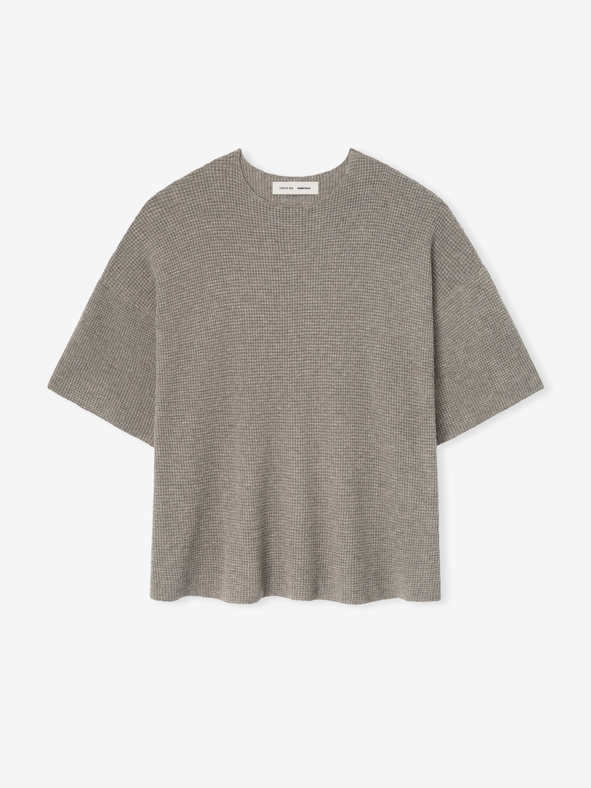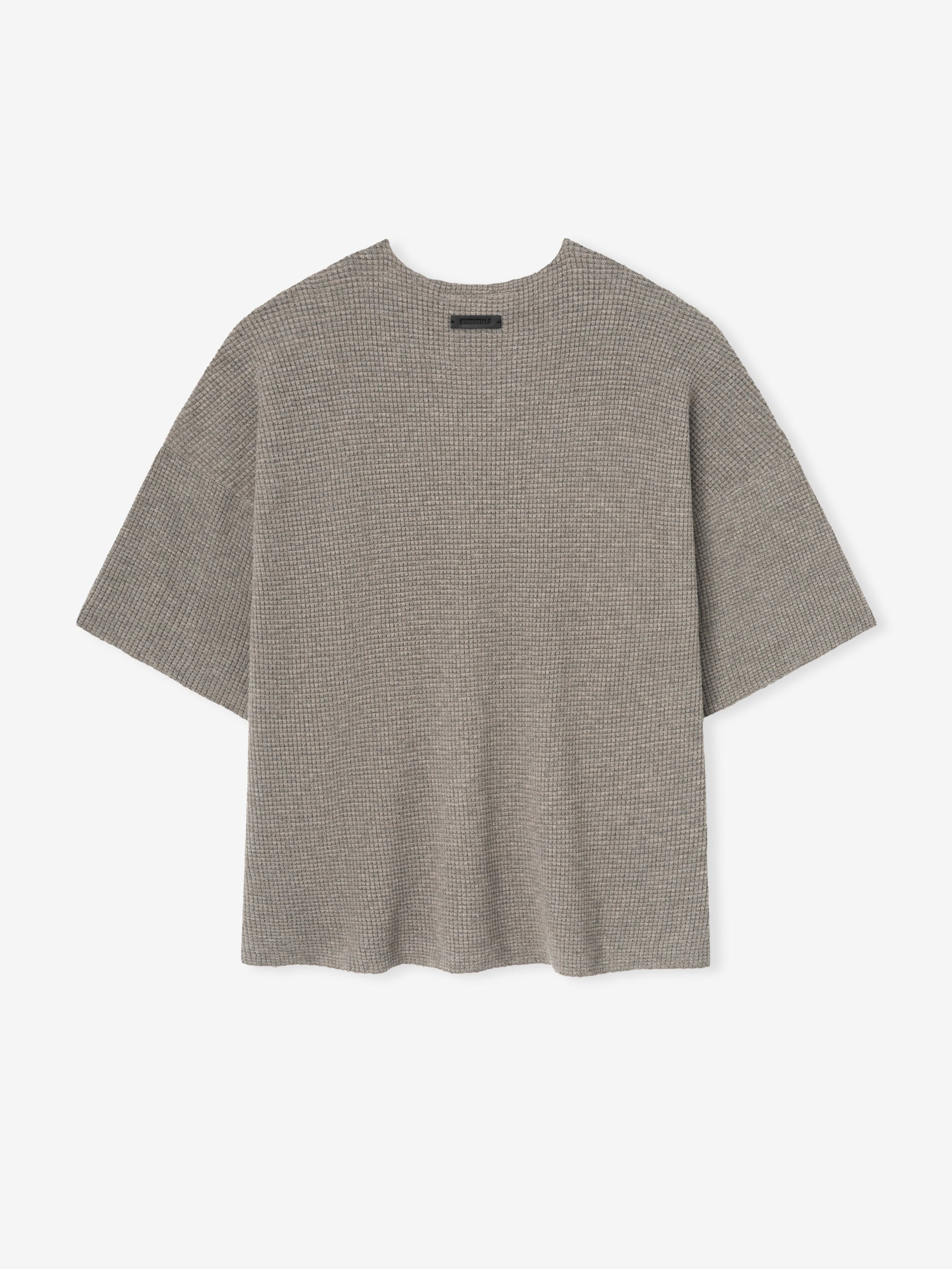 The Waffle Short Sleeve Sweater is made from heavyweight poly-nylon knit for warmth with stretch comfort. The fit is relaxed with drop shoulders. A "Fear of God Essentials" rubberized label is stitched at the back collar.