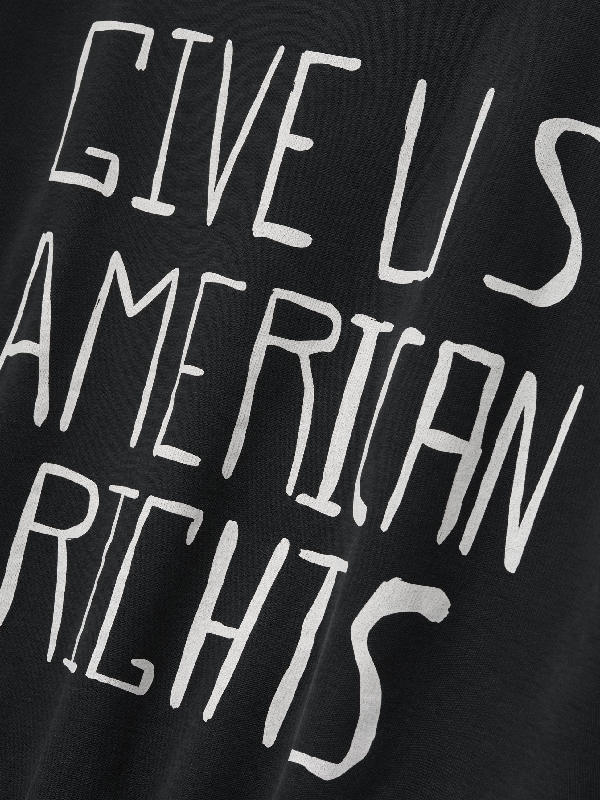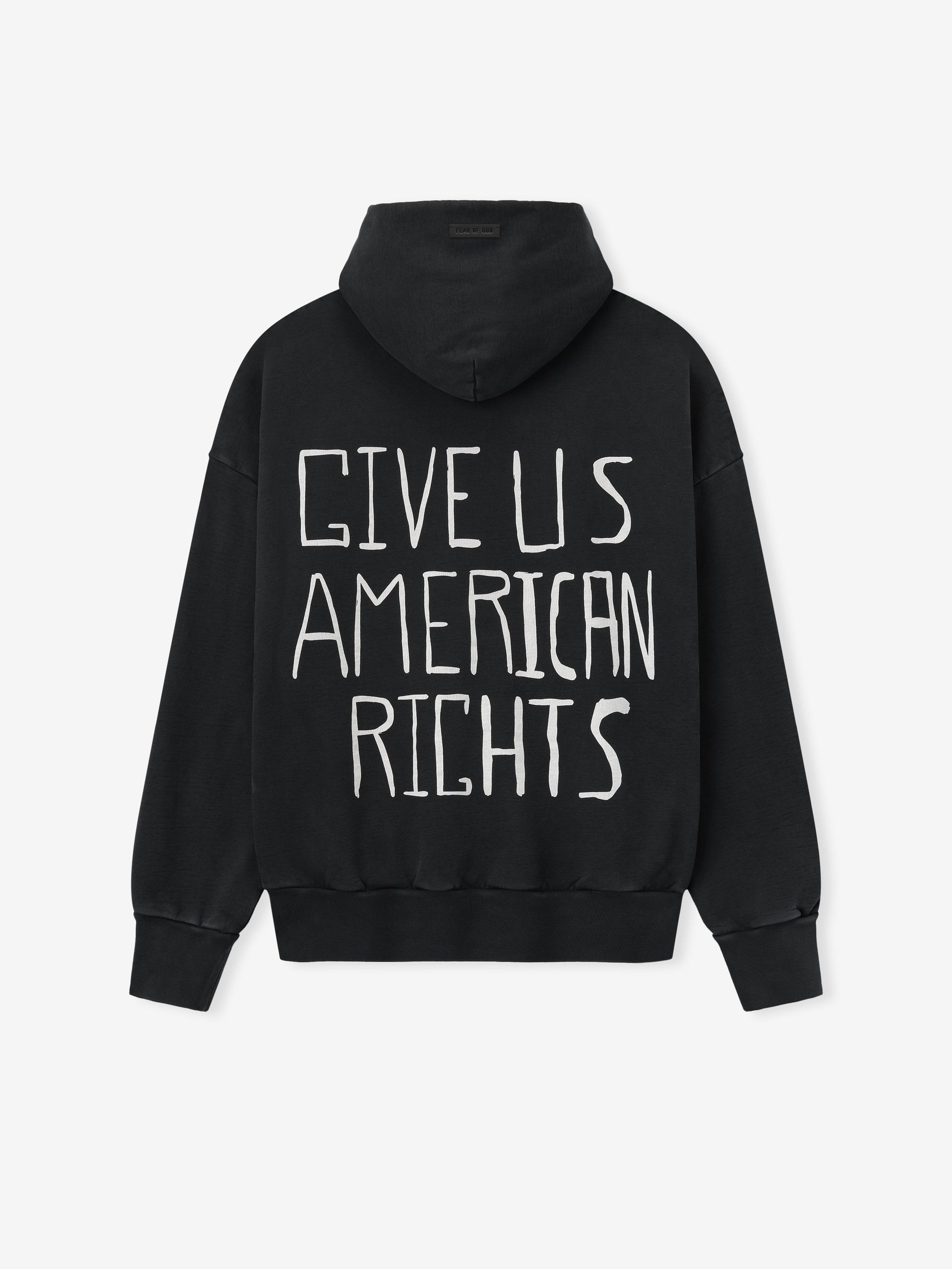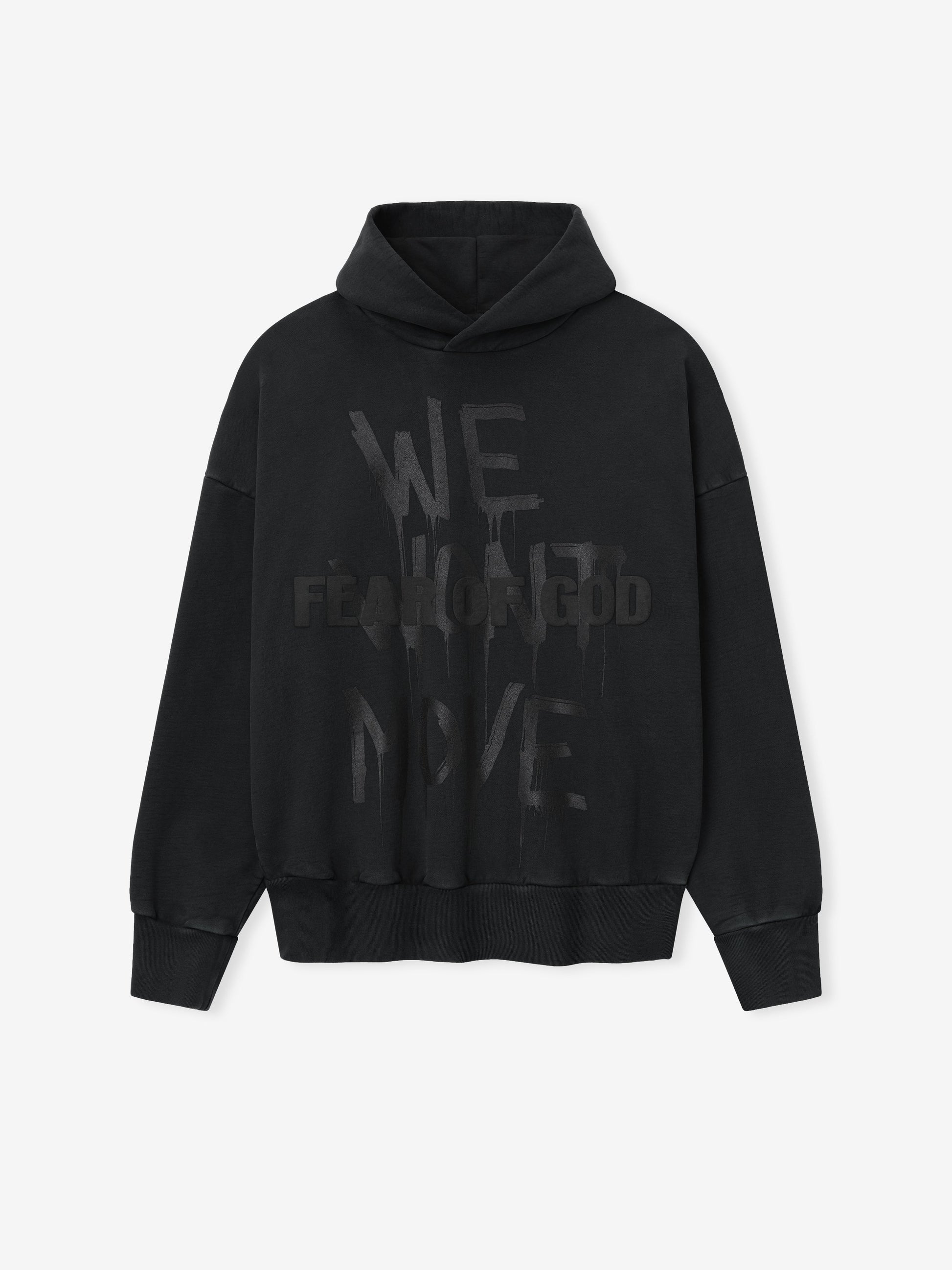 The We Won't Move Hoodie is crafted in the USA from 100% cotton fleece and is designed with a vintage fit for a shrunken, cropped style. It features hand-printed graphics inspired by the Civil Rights movement. The piece undergoes garment washing, sun fading, and hand-vintaging treatments to achieve an authentic, time-worn appearance. Additional details include rib-knit cuffs, ribbed waist hem, and a Fear of God label.