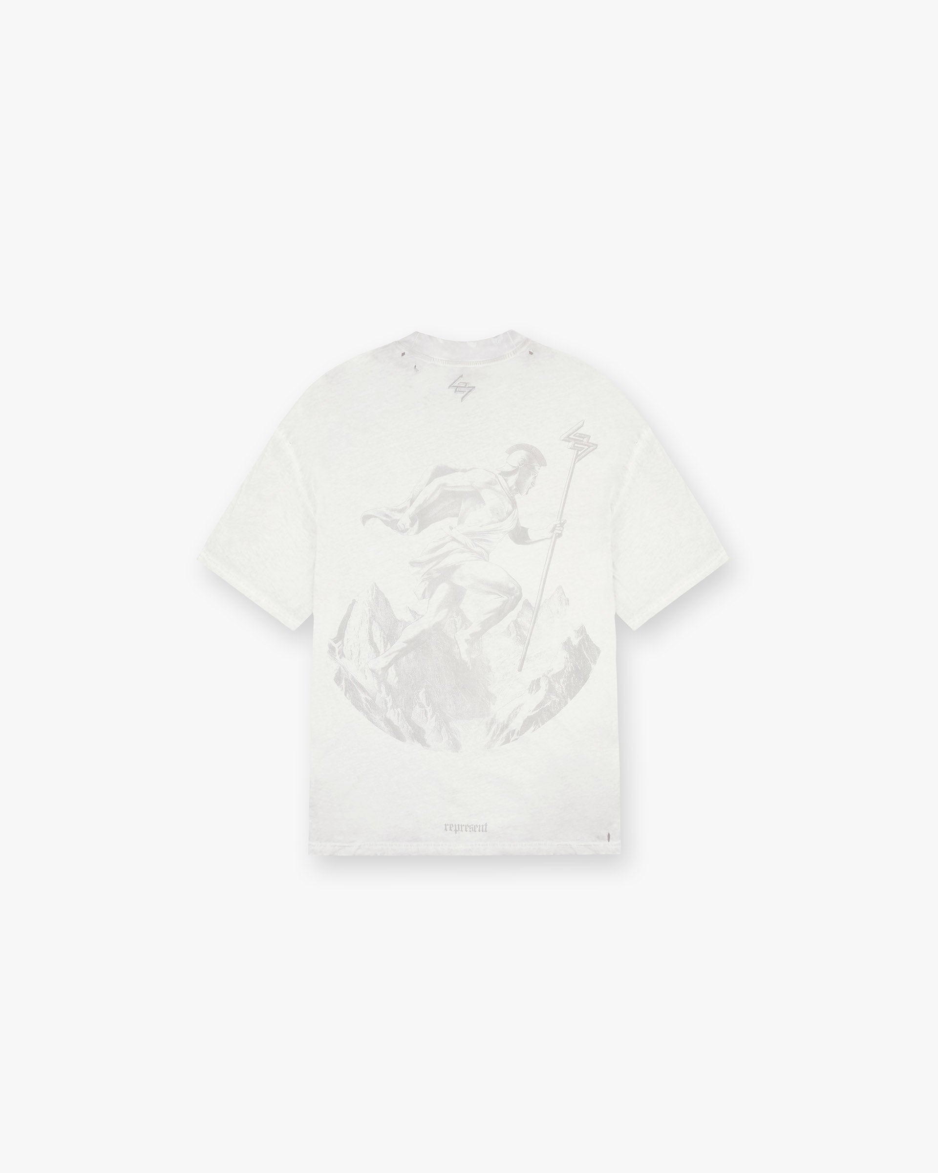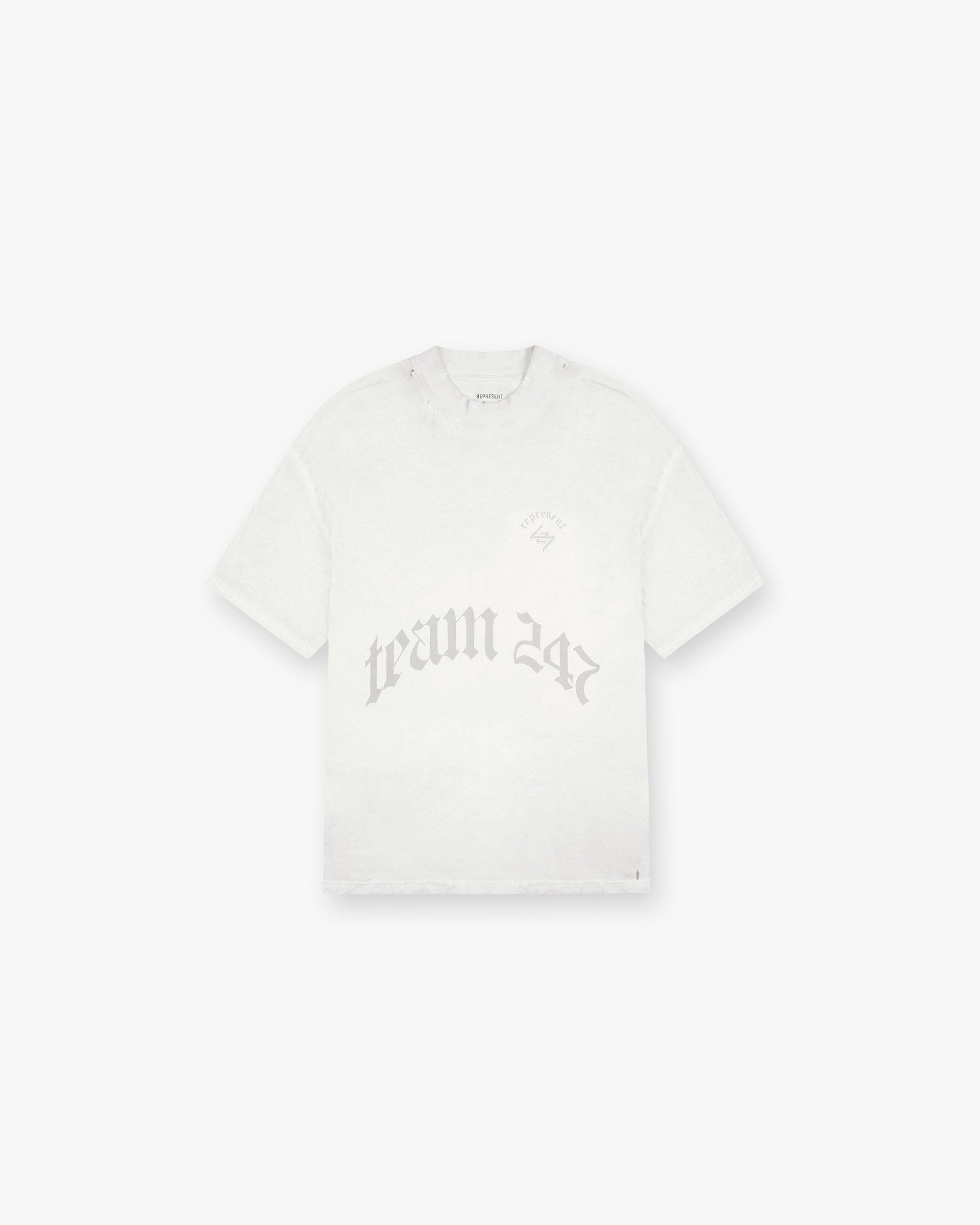 The WG247 T-Shirt in Washed Bleach is built to perform, with a meticulously detailed vintage aesthetic. The t-shirt is crafted from a lighter weight natural jersey cotton which allows air to circulate, affording a high degree of breathability and thermoregulatory properties, with a slightly oversized fit. It has a vintage wash to the fabric, and our gothic inspired typography graphics; with Team 247 and 247 logo to the front, Represent to the back hem, and a Spartan warrior design to the back, representing the pursuit of greatness embodied by the 247 mission. The t-shirt is finished with distressing details to the collar, hem, shoulders and under arm.